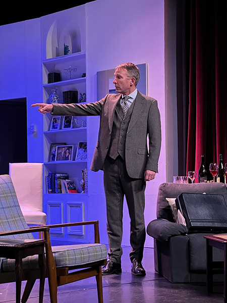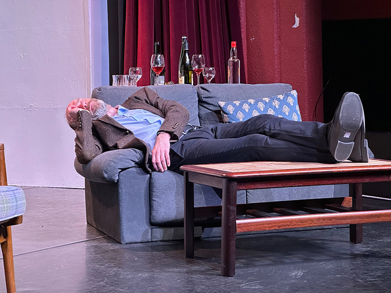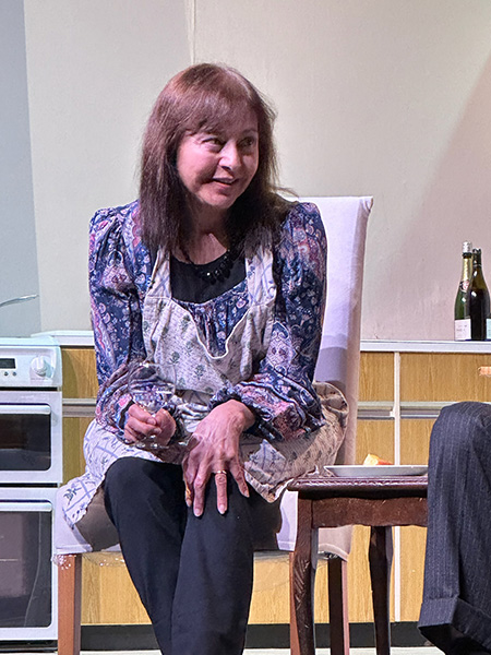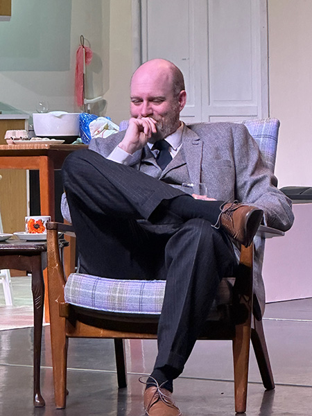 Molly Jackson as Gerald’s wife Ruth, complements Glossop with charm and wit. Her frequent asides, often sarcastic retorts to her unforgiving mother-in-law – Lila Roth, provide light relief. At times, she is rather too compelling while performing her domestic duties whilst the action happens elsewhere on the split stage. Although her portrayal of domestic routines feels natural and lived-in, further emphasising the contrast between ordinary family life and the weight of historical revelation. There are moments, however, particularly in the second act, when Ruth’s reaction to Gerald’s deceit could have been more emotionally charged as these sometimes felt a little too controlled.
