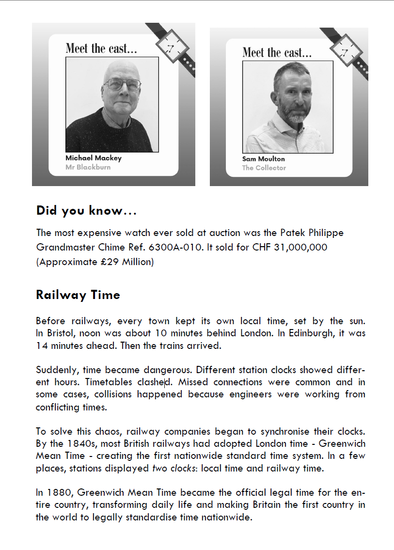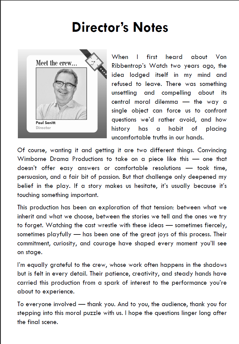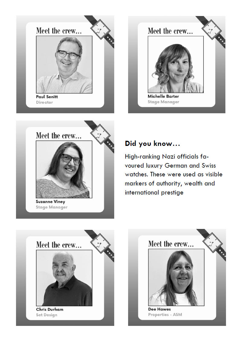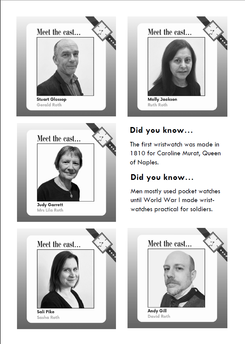 In this reimagining, we meet Gerald Roth, patriarch of a Jewish family in Middlesex. A struggling wine merchant, he sends his inherited watch for repair and what begins as a routine task becomes a profound moral dilemma. Gerald learns of its dark origins which make it a valuable albeit tainted heirloom. We follow his journey through the implications of his discovery, his initial outrage and disgust; does ownership of such an article make him complicit in the previous owner’s actions? Gerald’s internal struggle grows as he faces financial pressures and we see how it affects his relationships with those closest to him as they unravel the secrets of the watch.