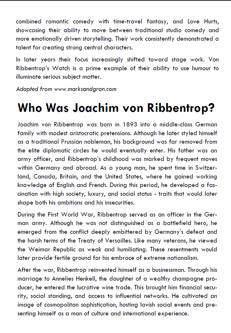 The play isn’t true, but the watch is. In 1985, Laurence Marks went window shopping and saw a very elegant Art Deco wristwatch, so treated himself. Two decades later, when the pre-war watch started losing time, he took it to be repaired. When the jeweller called to ask if the watch was a family heirloom Laurence confirmed it wasn’t, and the jeweller replied: “In that case come to the shop. I think there’s something you should see.” Engraved on the inside back of the watch were the initials JVR above a neat little swastika. JVR could only mean Joachim .on Ribbentrop, Hitler’s Foreign Minister. The prior ownership was confirmed by Sotheby’s and Laurence was told it would fetch a great deal at auction. Laurence was tempted to sell it but told his friend Maurice Gran, who said: “How can you possibly profit from a Nazi watch?” After a long debate, they decided there was only one thing to do: write a play’aboutthis very dilemma. ‘Von Ribbentrop’s Watch’ is that play.